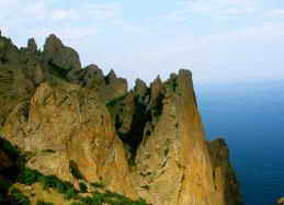 Карадаг - Черная гора - самый древний вулкан в нашей стране. Его возраст - 170-150 миллионов лет. Карадаг - это целый мир удивительных каменных пиков и горных вершин; мир зеленых дубрав и разноцветных степей; мир причудливых скалистых мысов, разделяющих бесконечные бухты и бухточки; мир бездонных ущелий и уютных долин. Причудливые фигуры изваяны в вулканических туфах ветрами, дождями и солнцем: Маяк, Шайтан, Пряничный конь, Сокол, Пирамида, Сфинкс...