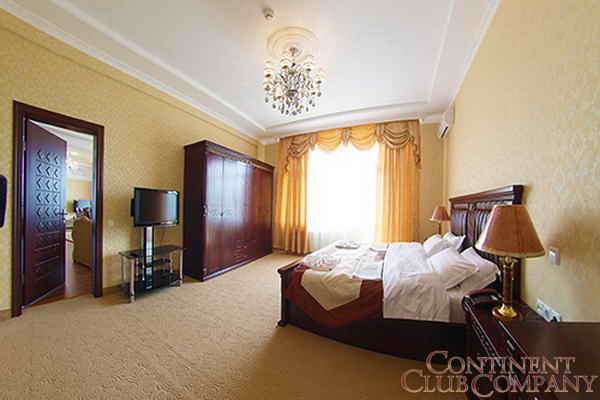 - 2-комнатный 2-местный Люкс повышенной комфортности со всеми удобствами (туалет, умывальник, ванна). В номере: двуспальная кровать, гостиная с мягким диваном, креслами и журнальным столиком, мини-бар, сейф, телевизор, кондиционер, прикроватные тумбочки, шифоньер, зеркало, телефон, стол, 2 кресла, 2 балкона с видом на море (в каждом столик, 2 кресла), в ванной комнате фен, набор мини-парфюмерии, комплект полотенец, халаты, тапочки. Общая площадь 50 кв.м