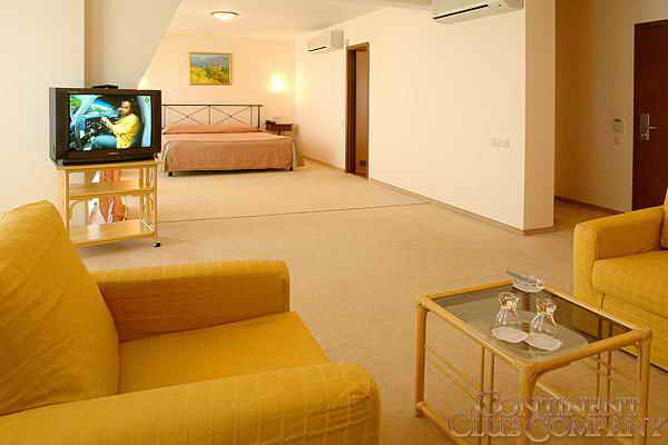 2-комнатный 2-местный «люкс». Номера расположены на 3, 4 этажах. В номере стильная итальянская мебель, двуспальная кровать, спутниковое телевидение, индивидуальная система отопления и кондиционирования, мини-бар, фен, телефон, цифровой сейф, балкон. Жилая площадь 50 кв. м;