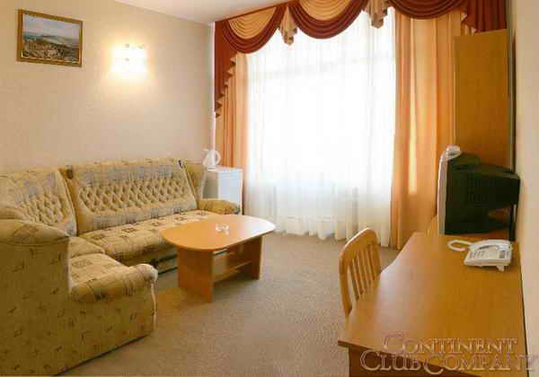 2-комнатный 2-местный «люкс» (туалет, умывальник, душ). В номере: удобный диван и письменный стол в гостиной, просторная кровать в спальне, телевизор, холодильник, кондиционер, телефон, доступ в Интернет, электрочайник, терраса с летней мебелью.