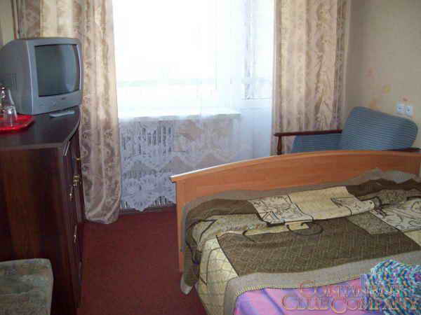1-комнатный 2-местный «Эконом +» со всеми удобствами (душ, туалет, умывальник). В номере: 2 односпальные кровати, 2 тумбочки, стол, стулья, холодильник, телевизор (кабельное ТВ), электрочайник, балкон. Ремонт среднего качества. Общая площадь - 17,4 м.кв.